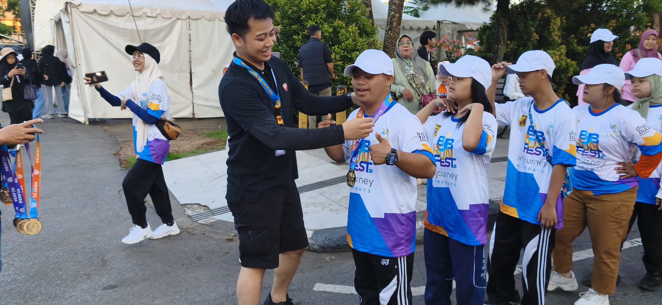 Di garis finis, momen paling mengharukan terjadi ketika anak-anak Down Syndrome menerima medali finisher. Senyum mereka mengembang, sebagian memeluk orang tua, sebagian lagi mengangkat medalinya tinggi-tinggi.