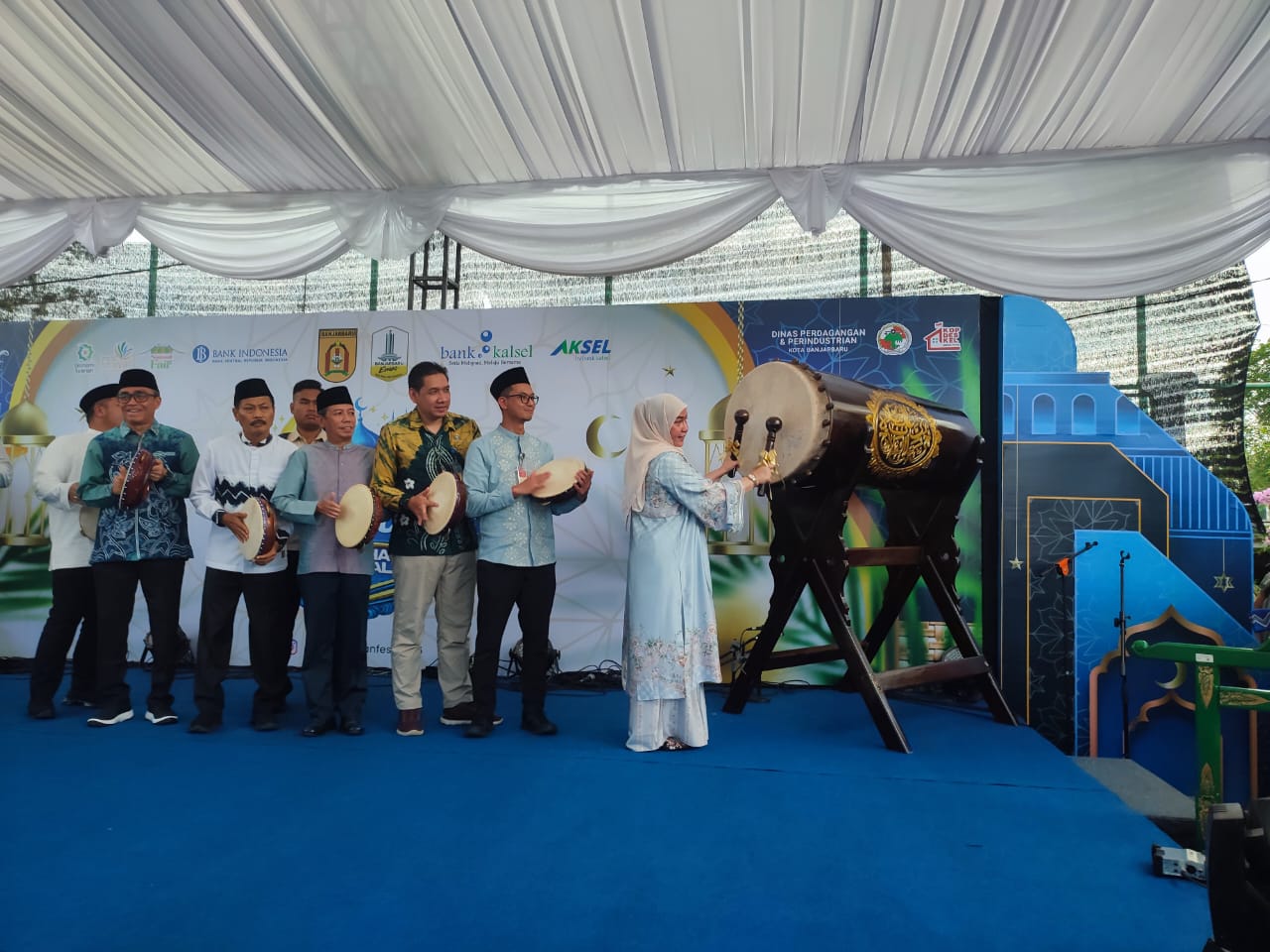 Foto : Wali Kota Banjarbaru Hj. Erna Lisa Halaby menabuh beduk sebagai tanda resmi dibukanya Pasar Wadai Ramadan 1447 H/2026 M di Lapangan dr. Murdjani, Kamis (19/2/2026) sore.(BE)