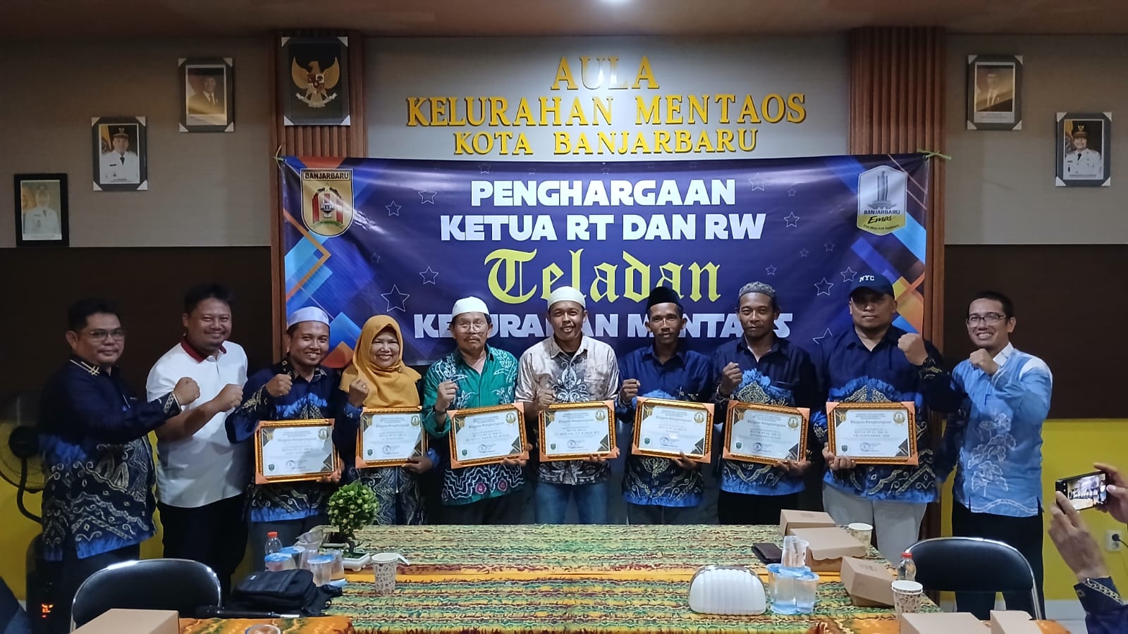 Foto : Kelurahan Mentaos memberikan penghargaan kepada Ketua RT dan RW Teladan dalam Penganugerahan RT/RW Teladan di Aula Kelurahan Mentaos, Kecamatan Banjarbaru Utara, Sabtu (25/4/2026), sebagai bentuk apresiasi atas dedikasi dan inovasi dalam pelayanan kepada masyarakat.(BE)