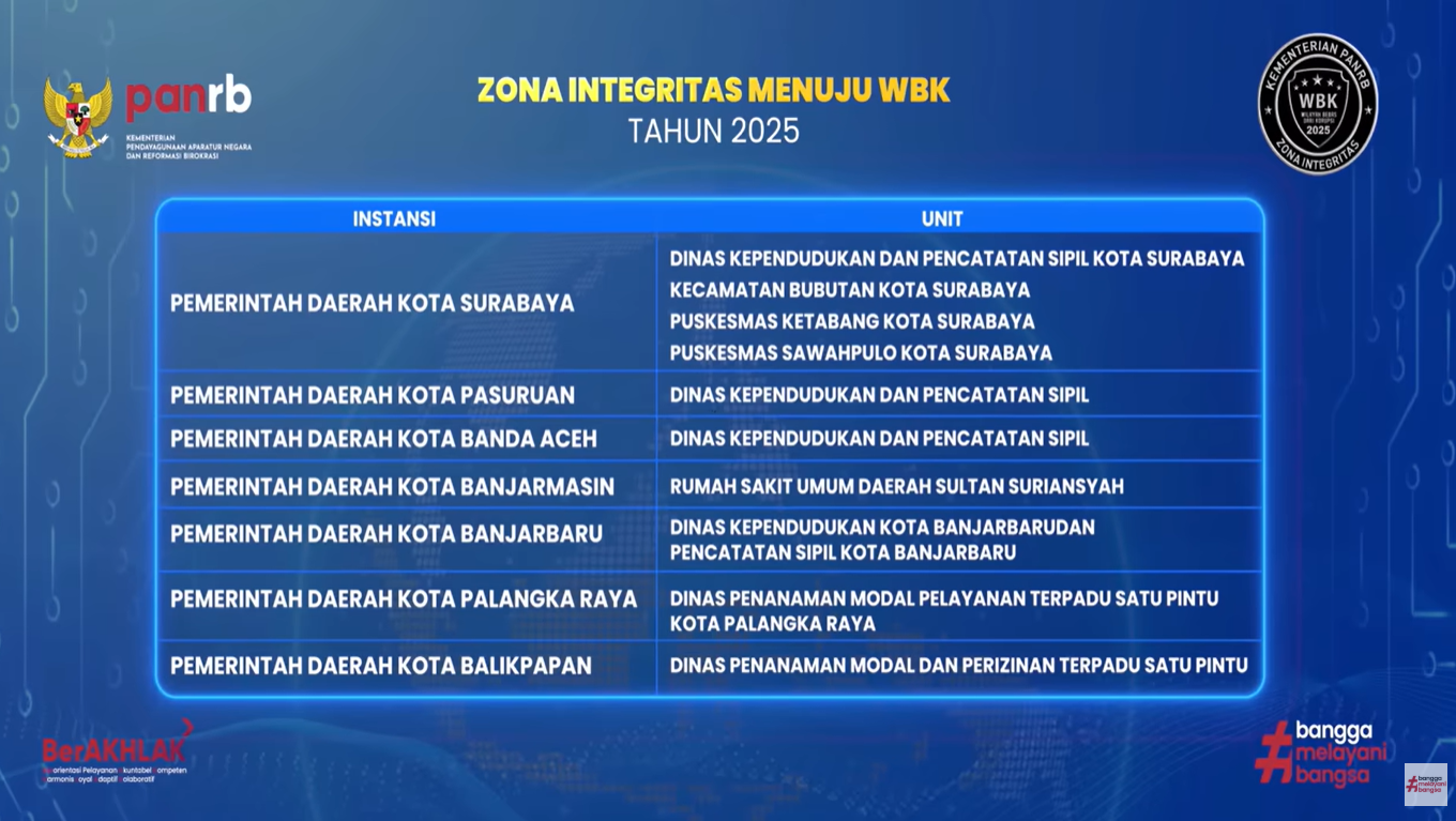 Berdasarkan hasil evaluasi nasional, nilai rata-rata SAKIP kementerian/lembaga mencapai 73,61, pemerintah provinsi 69,05, dan pemerintah kabupaten/kota 64,89. Sepanjang 2025, sebanyak 297 instansi pemerintah berpartisipasi dalam penilaian ZI, dan 133 di antaranya dinyatakan lolos menuju predikat WBK dan/atau WBBM.