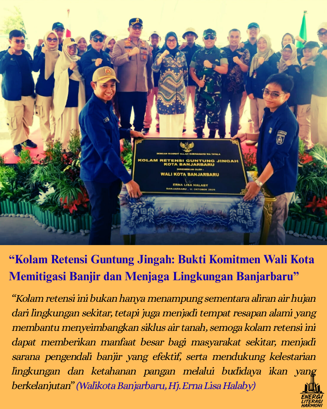 Mari kita jadikan Kolam Retensi Guntung Jingah sebagai simbol kebanggaan bersama, kita jaga kebersihannya, rawat lingkungannya, dan manfaatkan dengan sebaik-baiknya, ketika warga ikut menjaga, Banjarbaru akan semakin tangguh menghadapi banjir — sekaligus makin nyaman untuk kita tinggali bersama. Bagi warga yang menerima informasi ini, ayo sebarkan kabar baik ini kepada tetangga dan komunitas sekitar. Semakin banyak yang tahu, semakin kuat pula semangat kita menjaga Banjarbaru tetap elok, maju, adil dan sejahtera bagi semua.