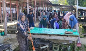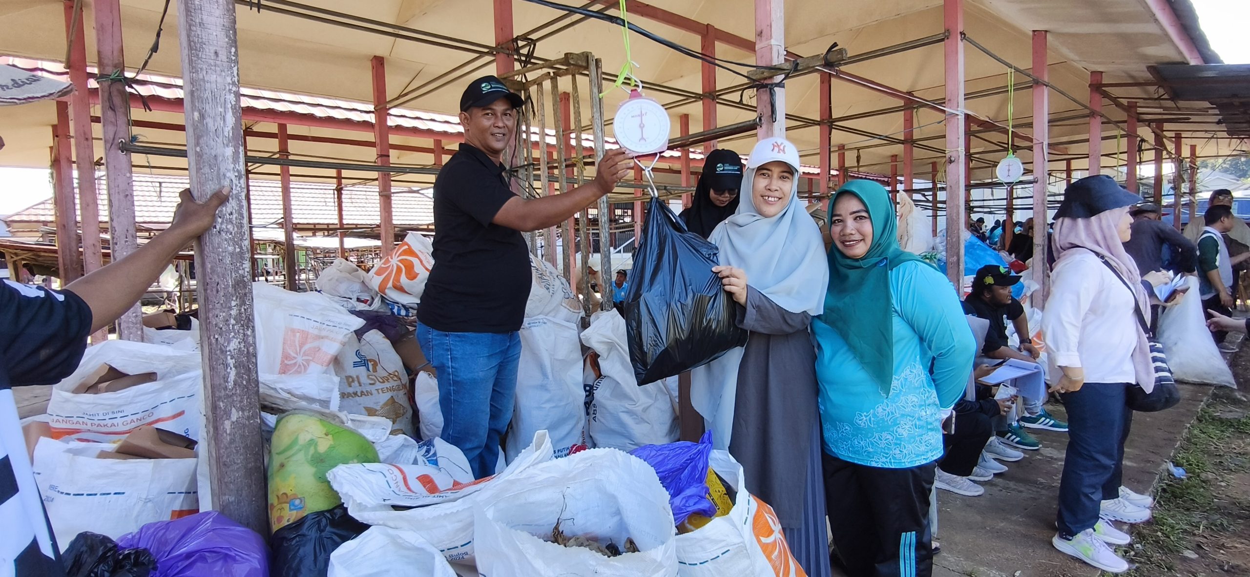 Foto : Kepala Dinas Lingkungan Hidup Kota Banjarbaru, Shanty Eka, menimbang hasil korvei gotong royong bersih sampah pada rangkaian Hari Jadi ke-27 Banjarbaru di Pasar Galuh Cempaka, Minggu (12/4/2026).(BE)