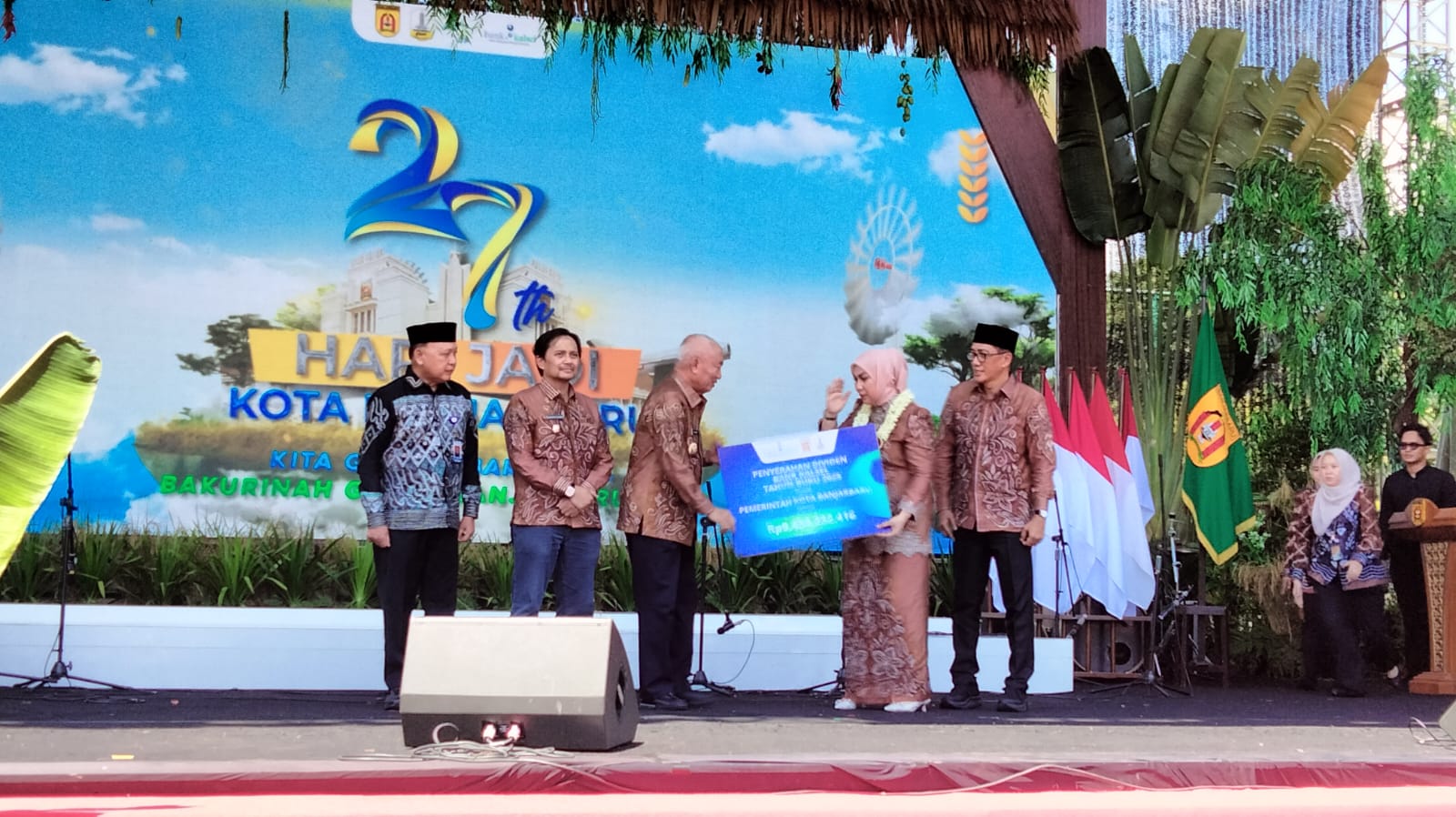 Wali Kota Banjarbaru, Hj Erna Lisa Halaby menerima dana CSr dari Bank Kalsel dan Defiden dari PTAM Intan Banjar diserahkan oleh Gubernur Kalsel, H Muhidin pada momentum puncak hari jadi ke 27. (Foto : banjarbaruemas.com)