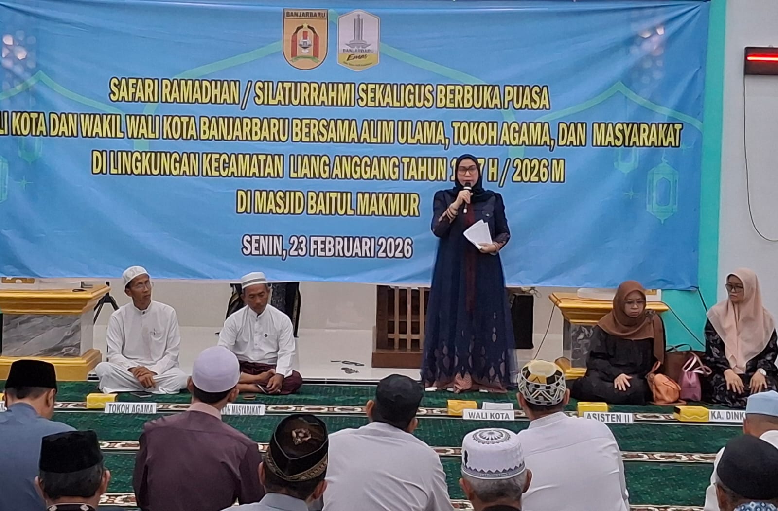 Foto : Wali Kota Banjarbaru, Erna Lisa Halaby, menyampaikan sambutan saat membuka Safari Ramadan 2026 di Masjid Baitul Makmur, Kecamatan Liang Anggang, Senin (23/2/2026). Dalam kesempatan itu, ia mengajak warga memperkuat toleransi dan kepedulian sosial.(BE) BANJARBARUEMAS.COM — Wali Kota Banjarbaru, Hj. Erna Lisa Halaby, memulai rangkaian Safari Ramadan 1447 Hijriah dengan mengunjungi Masjid Baitul Makmur, Jalan Sukamara, Kecamatan Liang Anggang, Senin (23/2/2026) sore. Kunjungan ini menjadi agenda perdana Pemerintah Kota Banjarbaru dalam menyapa warga selama bulan suci.